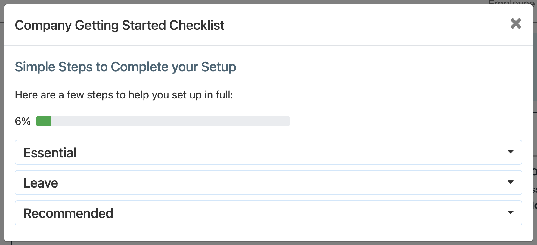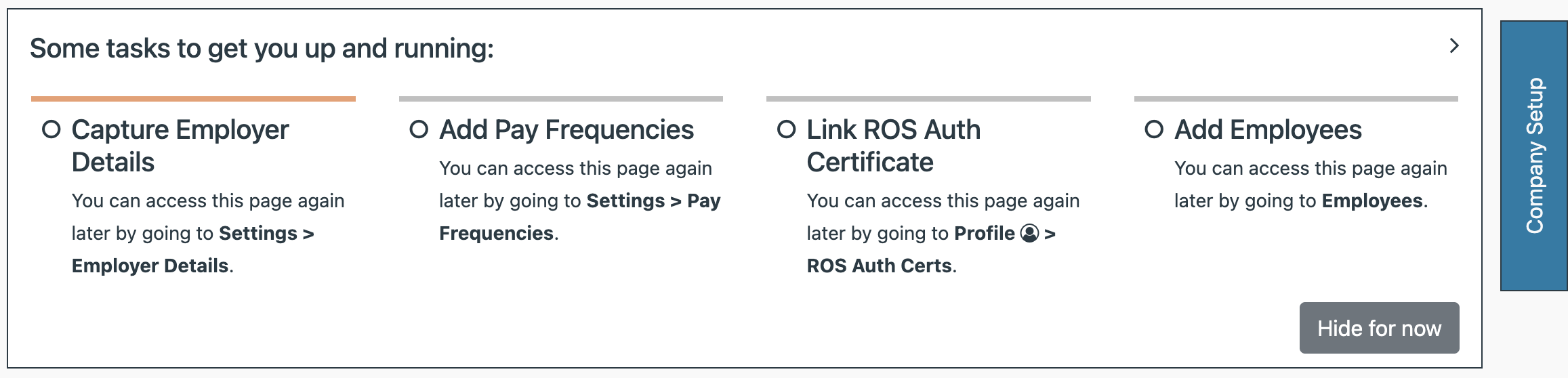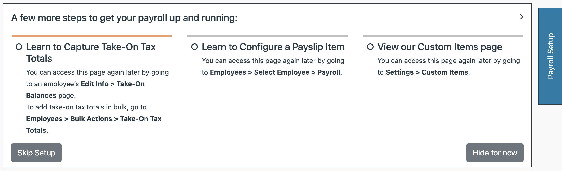 You will be guided through your payroll setup via the Payroll Setup card. You can hide and access this card in the same way as the Company Setup card.